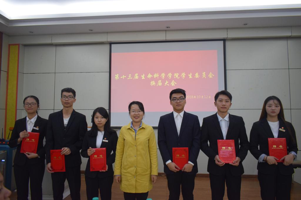 出席本次换届大会的嘉宾有生命科学学院团委老师杜静以及第十二届学生委员会成员。会议开始后,第十二届学生委员会主席团代表梁超珍进行开幕致辞,并对新任干部提出鼓励和要求。主持人曾晓慧宣读了第十三届学生委员会成员名单,团委指导老师杜静与第十二届学生委员会主席团为他们颁发了聘书。杜老师发言表达了对新一届学生委员会工作的期望,希望他们可以在新的一年里做出更好的成绩。随后第十三届学生委员会主席殷祖浩代表第十三届学生委员会全体成员进行发言,表示会在未来的工作中认真学习上一届学生委员会的工作态度,严谨细致,一丝不苟的完成团委的工作任务,争取做的更好。换届大会结束后,办公室主任刘玉琼为到场的同学进行了公文培训,为学生委员会新成员能更好的工作打下了夯实的基础,参加本次会议的成员在公文培训后有序签退离开。
