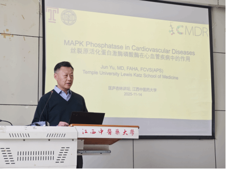 江中新闻网讯( 通讯员 张翔 20251114日下午,由中医学院·生命科学学院主办的第九期“匡庐杏林讲坛”系列讲座在湾里校区实验大楼A305成功举行。本次讲座特邀在心血管研究领域享有盛誉的余军教授,为我校师生带来了题为 “MAPK Phosphatase in Regulation of Cardiovascular Diseases” 的学术报告。余军教授是动脉粥样硬化和缺血性血管疾病研究领域的知名专家,先后在 Nature MedicineJournal of Clinical Investigation 等国际顶级期刊发表SCI论文140余篇,总引用因子超20000H-index高达54,并承担多项国际国内重大课题评审工作。余军教授以精炼的语言梳理了丝裂原活化蛋白激酶(MAPK)信号通路的研究脉络,系统介绍了MAPK激酶与磷酸酶在细胞信号转导中的核心作用与最新研究进展。他指出,MAPK通路如同细胞的“信息中枢”,而MAPK磷酸酶则扮演着关键的“负向调控”角色,其功能平衡对维持心血管稳态至关重要。