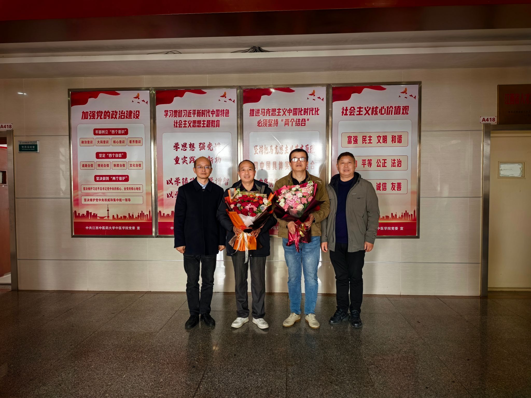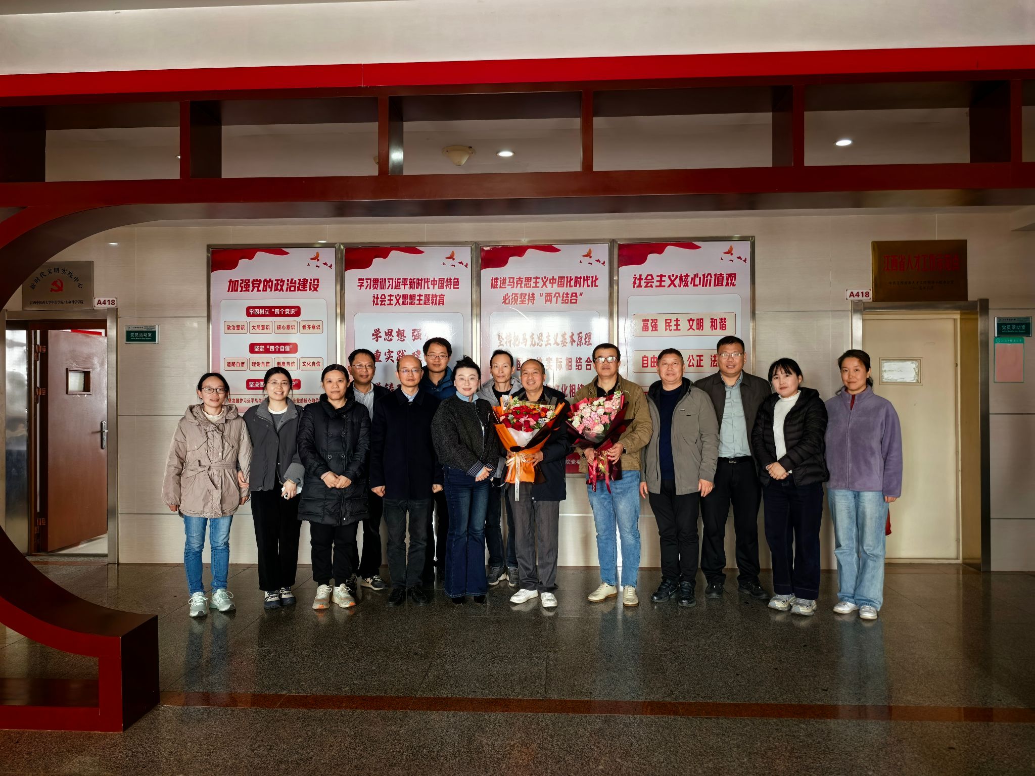 随后,党委负责人代表学院为两位退休教师献上鲜花,鲜花承载着全院职工最诚挚的敬意与祝福。活动尾声,全体参会人员与退休教师合影留念,镜头定格下这一温馨难忘的时刻。
